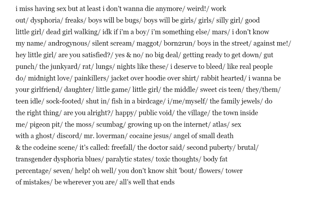 trans girl stuff playlist, 3.7k likes, "so not all of it is trans femme but it's a playlist i listen to when i'm dysphoric"